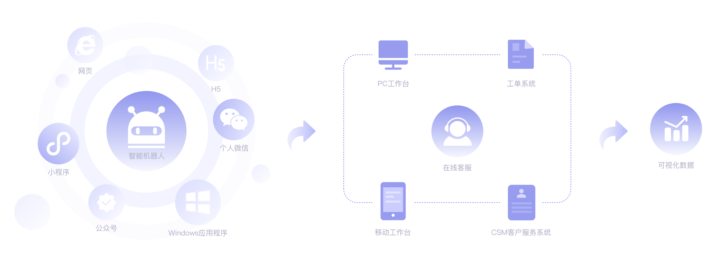 支持小程序、网站、H5等多渠道接入,一站客户服务平台,功能完善大,提升服务效能
